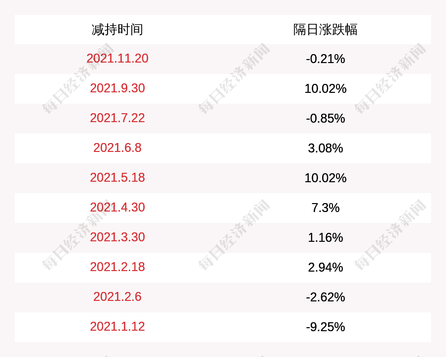 2. 和勝股份上次發(fā)布減持公告是2021年11月20日,第二個(gè)交易日下跌0.21%,和勝股份近一年共發(fā)布11次減持類公告。