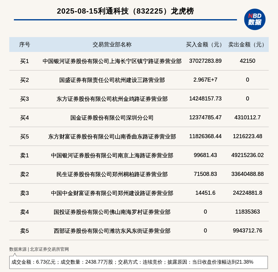 每經(jīng)訊,2025年8月15日,北交所上市公司利通科技(832225,收盤價:27.71元)登上龍虎榜,交易方式是連續(xù)競價,披露原因是當日收盤價漲幅達到21.38%,成交數(shù)量2438.77萬股,成交金額6.73億元。買一席位為中國銀河證券股份有限公司上海長寧區(qū)鎮(zhèn)寧路證券營業(yè)部,買入3702.73萬元;賣一席位為中國銀河證券股份有限公司南京上海路證券營業(yè)部,賣出4921.52萬元。