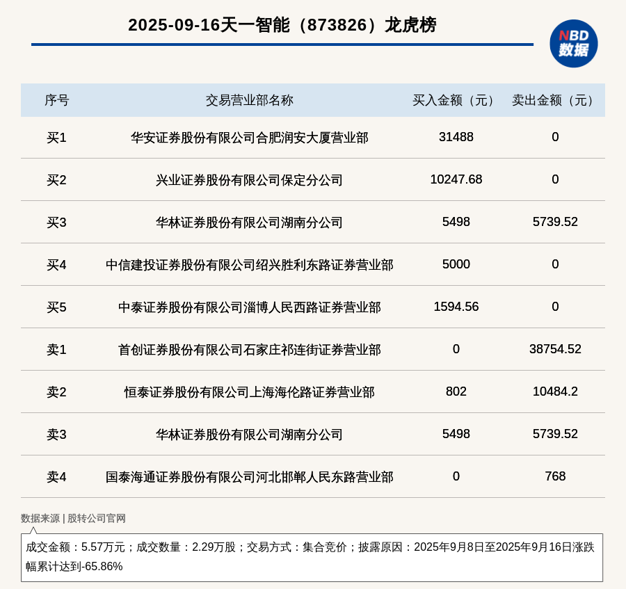 每經(jīng)訊,2025年9月16日,新三板創(chuàng)新層公司天一智能(873826,收盤價:1.7元)登上龍虎榜,交易方式是集合競價,披露原因是2025年9月8日至2025年9月16日漲跌幅累計達到-65.86%,成交數(shù)量2.29萬股,成交金額5.57萬元。買一席位為華安證券股份有限公司合肥潤安大廈營業(yè)部,買入3.15萬元;賣一席位為首創(chuàng)證券股份有限公司石家莊祁連街證券營業(yè)部,賣出3.88萬元。