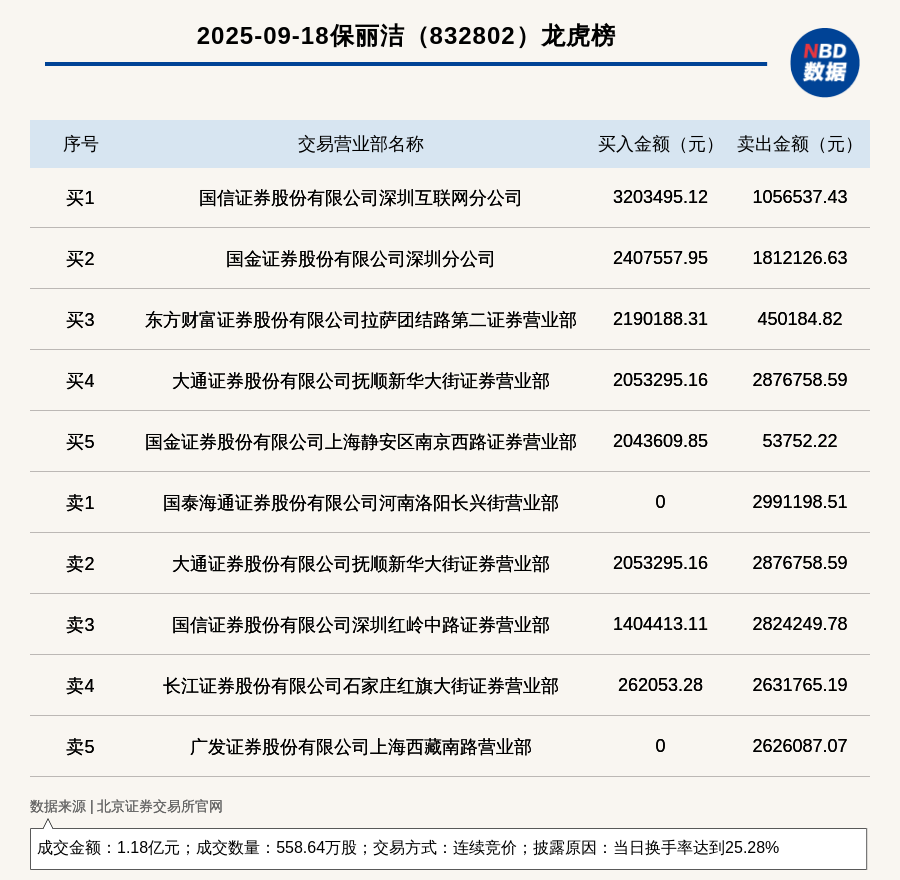 每經(jīng)訊,2025年9月18日,北交所上市公司保麗潔(832802,收盤價:20.59元)登上龍虎榜,交易方式是連續(xù)競價,披露原因是當日換手率達到25.28%,成交數(shù)量558.64萬股,成交金額1.18億元。買一席位為國信證券股份有限公司深圳互聯(lián)網(wǎng)分公司,買入320.35萬元;賣一席位為國泰海通證券股份有限公司河南洛陽長興街營業(yè)部,賣出299.12萬元。