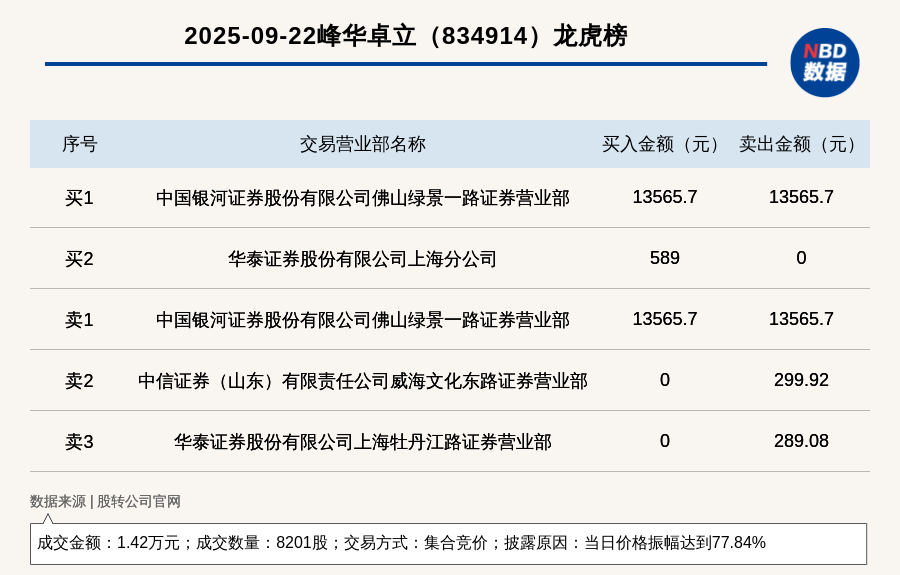 新三板基礎(chǔ)層公司峰華卓立登龍虎榜:當日價格振幅達到77.84%