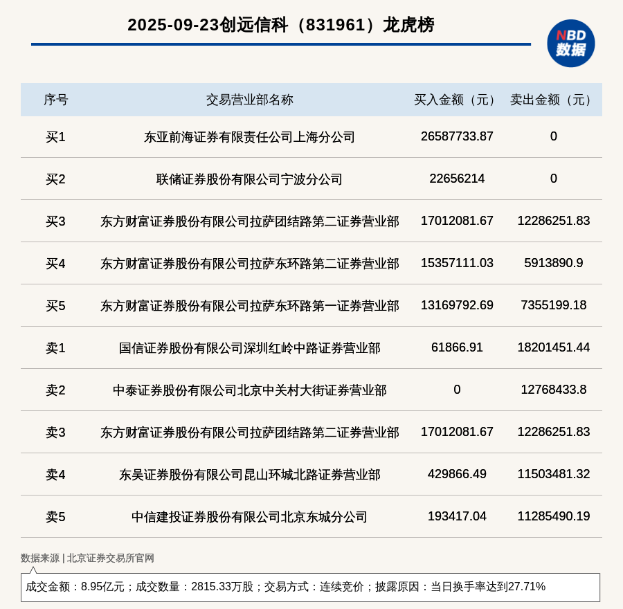 每經(jīng)訊,2025年9月23日,北交所上市公司創(chuàng)遠(yuǎn)信科(831961,收盤價(jià):29.48元)登上龍虎榜,交易方式是連續(xù)競(jìng)價(jià),披露原因是當(dāng)日換手率達(dá)到27.71%,成交數(shù)量2815.33萬(wàn)股,成交金額8.95億元。買一席位為東亞前海證券有限責(zé)任公司上海分公司,買入2658.77萬(wàn)元;賣一席位為國(guó)信證券股份有限公司深圳紅嶺中路證券營(yíng)業(yè)部,賣出1820.15萬(wàn)元。