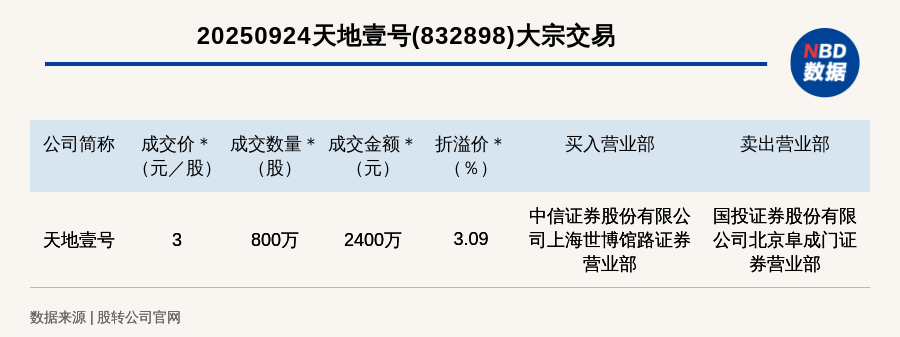 每經(jīng)訊,2025年9月24日,新三板創(chuàng)新層公司天地壹號(hào)(832898,收盤(pán)價(jià):2.91元)發(fā)生一筆大宗交易,成交價(jià)3元/股,成交數(shù)量800萬(wàn)股,成交金額2400萬(wàn)元,溢價(jià)3.09%。買(mǎi)入營(yíng)業(yè)部是中信證券股份有限公司上海世博館路證券營(yíng)業(yè)部,賣(mài)出營(yíng)業(yè)部是國(guó)投證券股份有限公司北京阜成門(mén)證券營(yíng)業(yè)部。