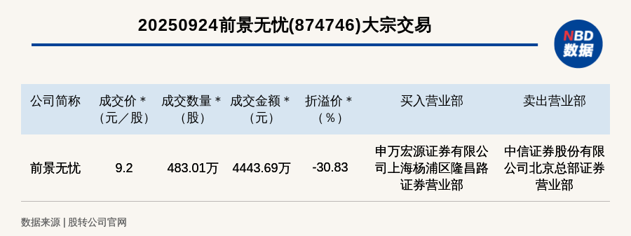 每經(jīng)訊,2025年9月24日,新三板創(chuàng)新層公司前景無憂(874746,收盤價(jià):13.3元)發(fā)生一筆大宗交易,成交價(jià)9.2元/股,成交數(shù)量483.01萬股,成交金額4443.69萬元,折價(jià)30.83%。買入營(yíng)業(yè)部是申萬宏源證券有限公司上海楊浦區(qū)隆昌路證券營(yíng)業(yè)部,賣出營(yíng)業(yè)部是中信證券股份有限公司北京總部證券營(yíng)業(yè)部。