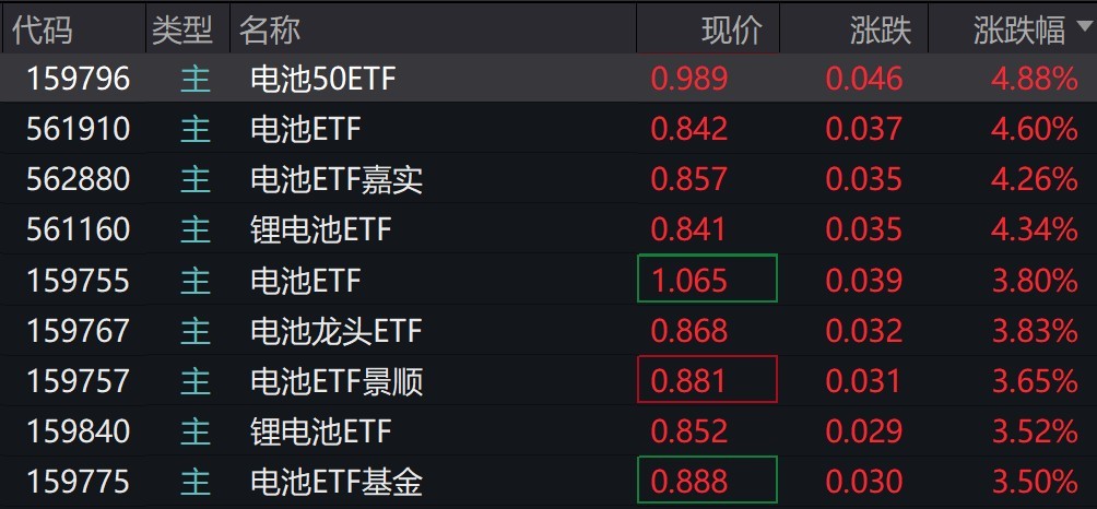 受盤面影響,多只電池相關(guān)ETF漲超3%。