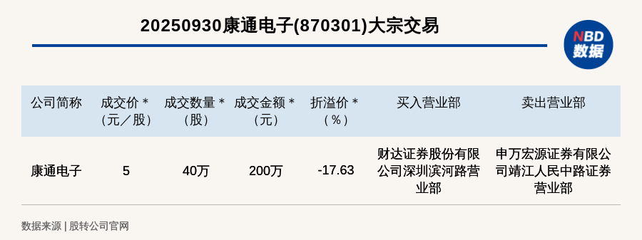 每經(jīng)訊,2025年9月30日,新三板創(chuàng)新層公司康通電子(870301,收盤價(jià):6.07元)發(fā)生一筆大宗交易,成交價(jià)5元/股,成交數(shù)量40萬(wàn)股,成交金額200萬(wàn)元,折價(jià)17.63%。買入營(yíng)業(yè)部是財(cái)達(dá)證券股份有限公司深圳濱河路營(yíng)業(yè)部,賣出營(yíng)業(yè)部是申萬(wàn)宏源證券有限公司靖江人民中路證券營(yíng)業(yè)部。