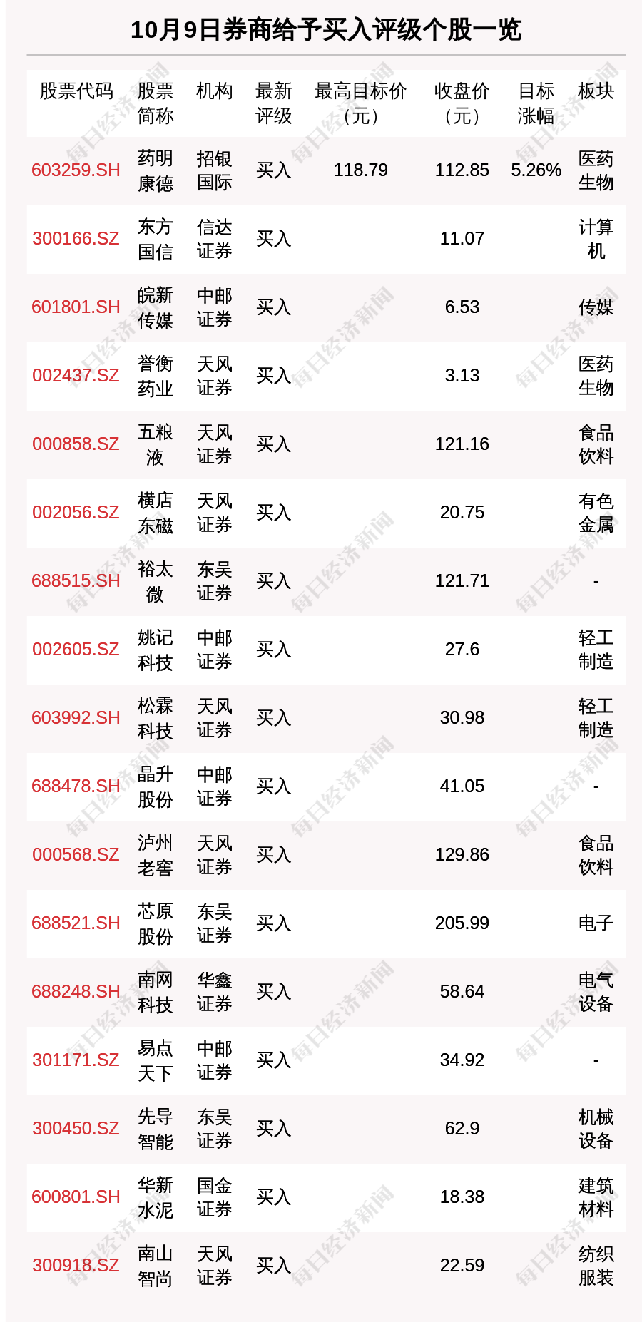 每經(jīng)AI快訊,10月9日,券商給予評(píng)級(jí)的個(gè)股數(shù)共有27只,獲得買入評(píng)級(jí)的個(gè)股數(shù)共有17只。1只個(gè)股公布了目標(biāo)價(jià)格,藥明康德(603259.SH)預(yù)期漲幅是5.26%。