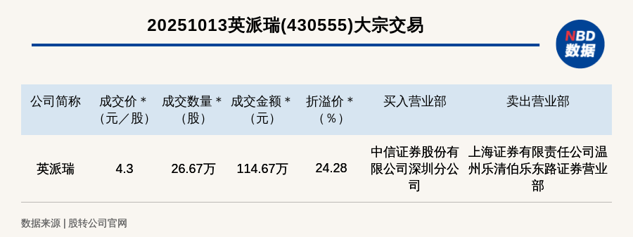 每經(jīng)訊,2025年10月13日,新三板創(chuàng)新層公司英派瑞(430555,收盤價(jià):3.46元)發(fā)生一筆大宗交易,成交價(jià)4.3元/股,成交數(shù)量26.67萬(wàn)股,成交金額114.67萬(wàn)元,溢價(jià)24.28%。買入營(yíng)業(yè)部是中信證券股份有限公司深圳分公司,賣出營(yíng)業(yè)部是上海證券有限責(zé)任公司溫州樂(lè)清伯樂(lè)東路證券營(yíng)業(yè)部。
