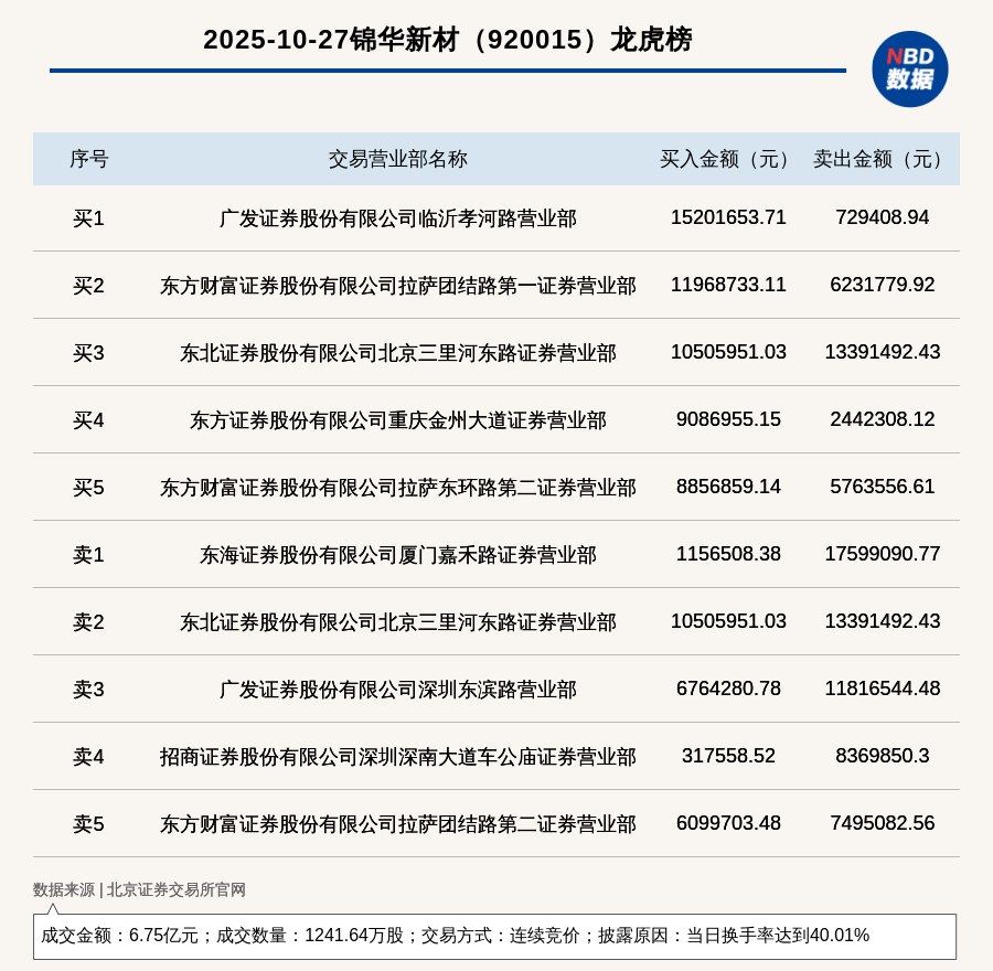 每經(jīng)訊,2025年10月27日,北交所上市公司錦華新材(920015,收盤價:50.19元)登上龍虎榜,交易方式是連續(xù)競價,披露原因是當(dāng)日換手率達(dá)到40.01%,成交數(shù)量1241.64萬股,成交金額6.75億元。買一席位為廣發(fā)證券股份有限公司臨沂孝河路營業(yè)部,買入1520.17萬元;賣一席位為東海證券股份有限公司廈門嘉禾路證券營業(yè)部,賣出1759.91萬元。