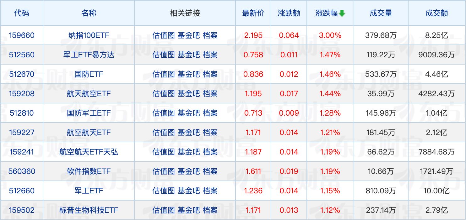 具體來看,納指100ETF領(lǐng)漲3.00%。軍工板塊盤中快速拉升,江龍船艇直線20cm漲停,國防軍工、航空航天相關(guān)ETF集體走強。