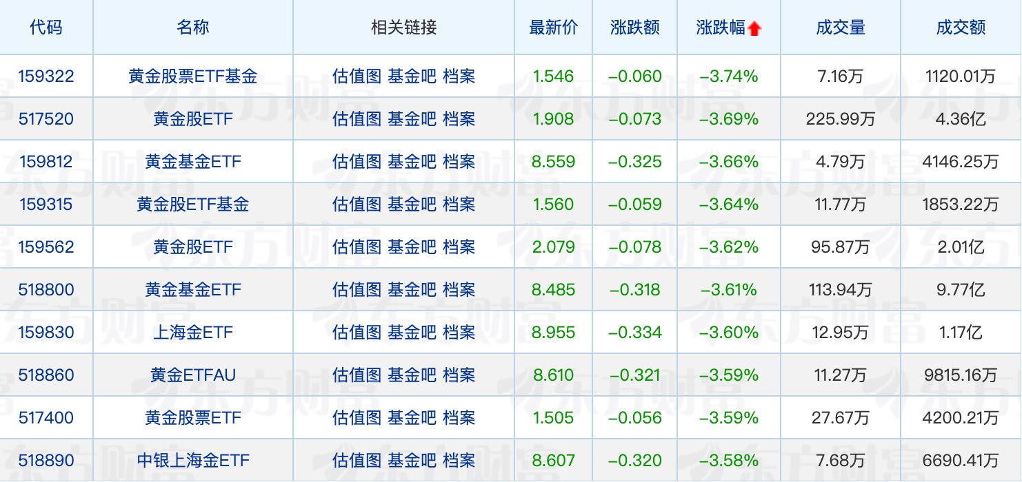 下跌方面,黃金股相關(guān)ETF全線回調(diào),最高下跌3.74%。