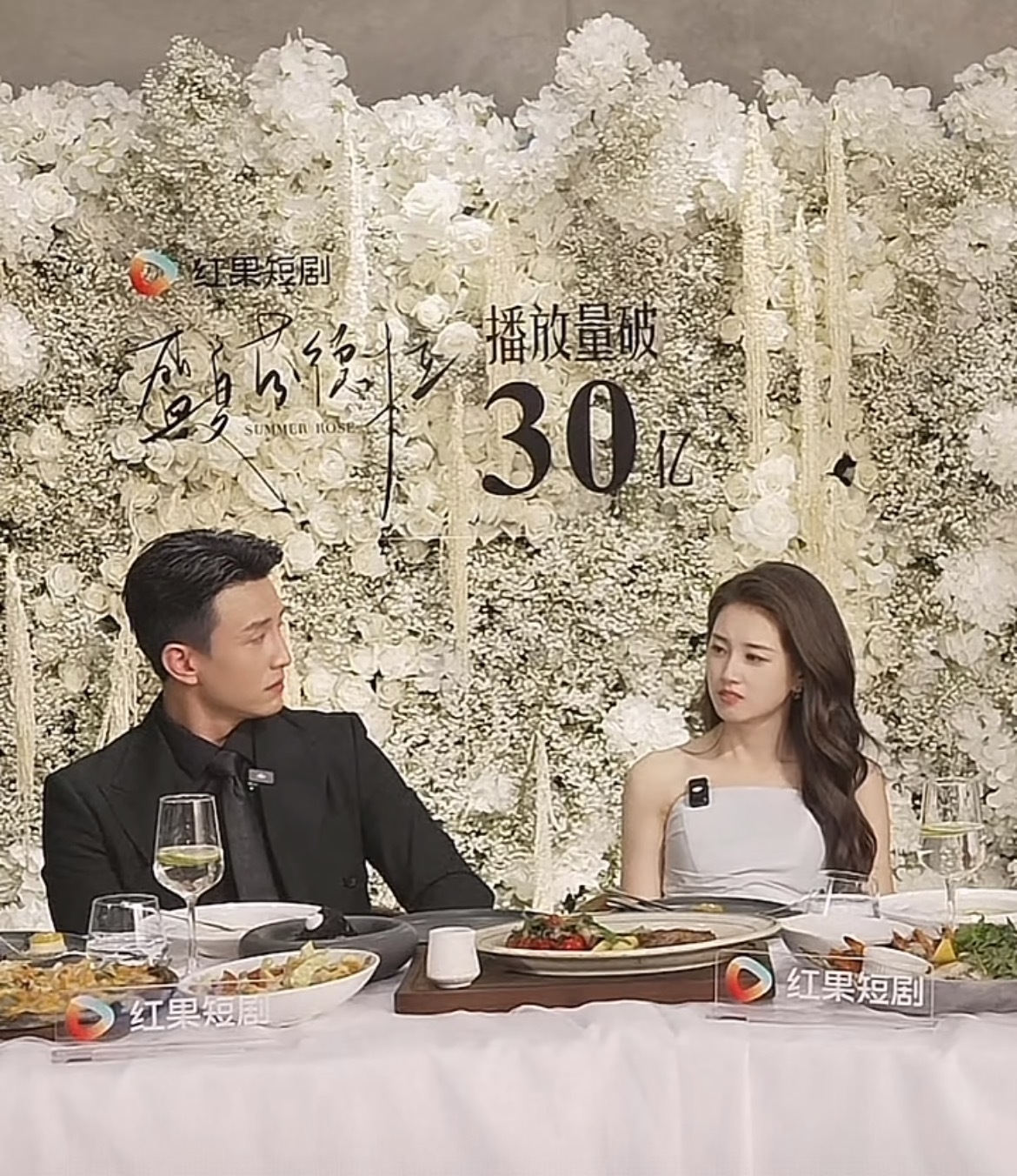 不僅在上線前,還有短劇會(huì)在上線后開(kāi)展慶功宴等類(lèi)型的直播活動(dòng)。短劇《念念有詞》成為紅果短劇平臺(tái)播放量最快破30億的短劇后,平臺(tái)為此在黃浦江上舉辦了一次郵輪慶功會(huì)。10 月,另一部爆款短劇《盛夏芬德拉》在杭州舉辦線下慶功宴暨粉絲見(jiàn)面會(huì),主演劉蕭旭、郭宇欣現(xiàn)場(chǎng)還原了劇中名場(chǎng)面,“#盛夏芬德拉見(jiàn)面會(huì)#”“#劉蕭旭郭宇欣都哭了#”話題也一度登上微博熱搜,實(shí)現(xiàn)完播后仍造熱度的效果。