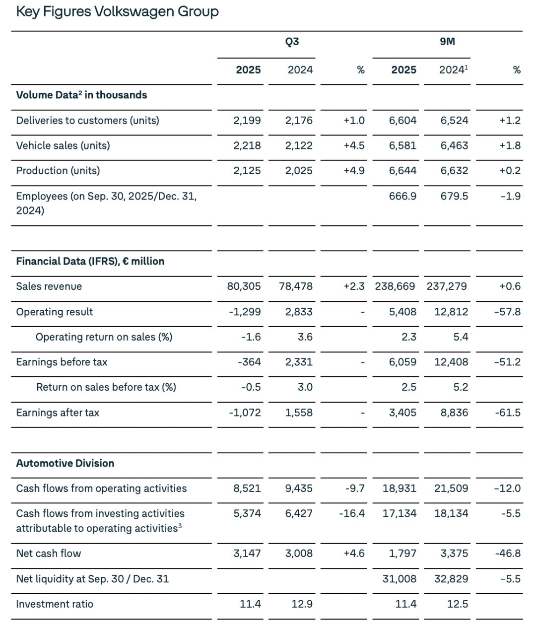 當(dāng)?shù)貢r間10月30日,德國大眾集團發(fā)布的三季度數(shù)據(jù)顯示,大眾集團2025年三季度凈利潤為負10.72億歐元,前三季度凈利潤與上年同期相比大幅下降61.5%至34億歐元。