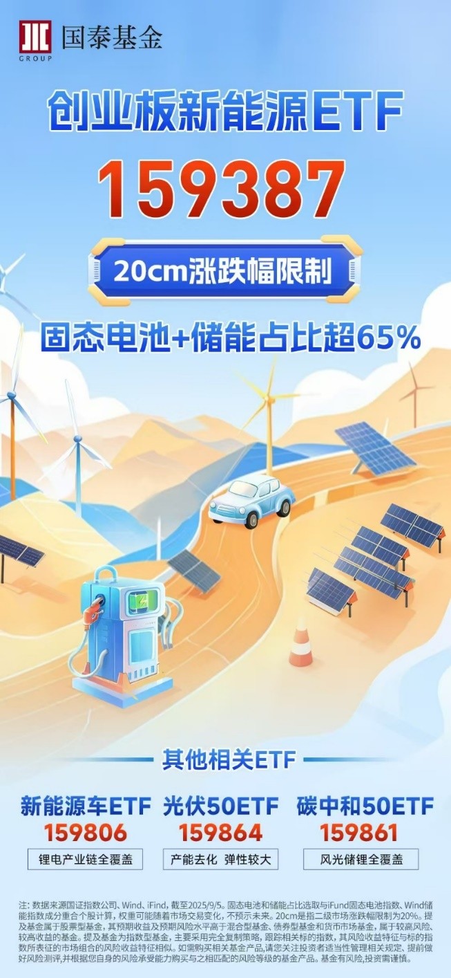 新能源產(chǎn)業(yè)鏈有望憑借技術(shù)拐點(diǎn),打開(kāi)新的增長(zhǎng)空間。創(chuàng)業(yè)板新能源ETF國(guó)泰(159387)跟蹤的是創(chuàng)業(yè)板新能源指數(shù),ETF最大漲跌幅達(dá)20%,該指數(shù)從市場(chǎng)中選取涉及清潔能源生產(chǎn)、存儲(chǔ)及應(yīng)用等業(yè)務(wù)的上市公司證券作為指數(shù)樣本,固態(tài)電池+儲(chǔ)能占比超65%。感興趣的小伙伴可以通過(guò)創(chuàng)業(yè)板新能源ETF國(guó)泰(159387)一鍵把握新能源板塊的投資機(jī)遇。