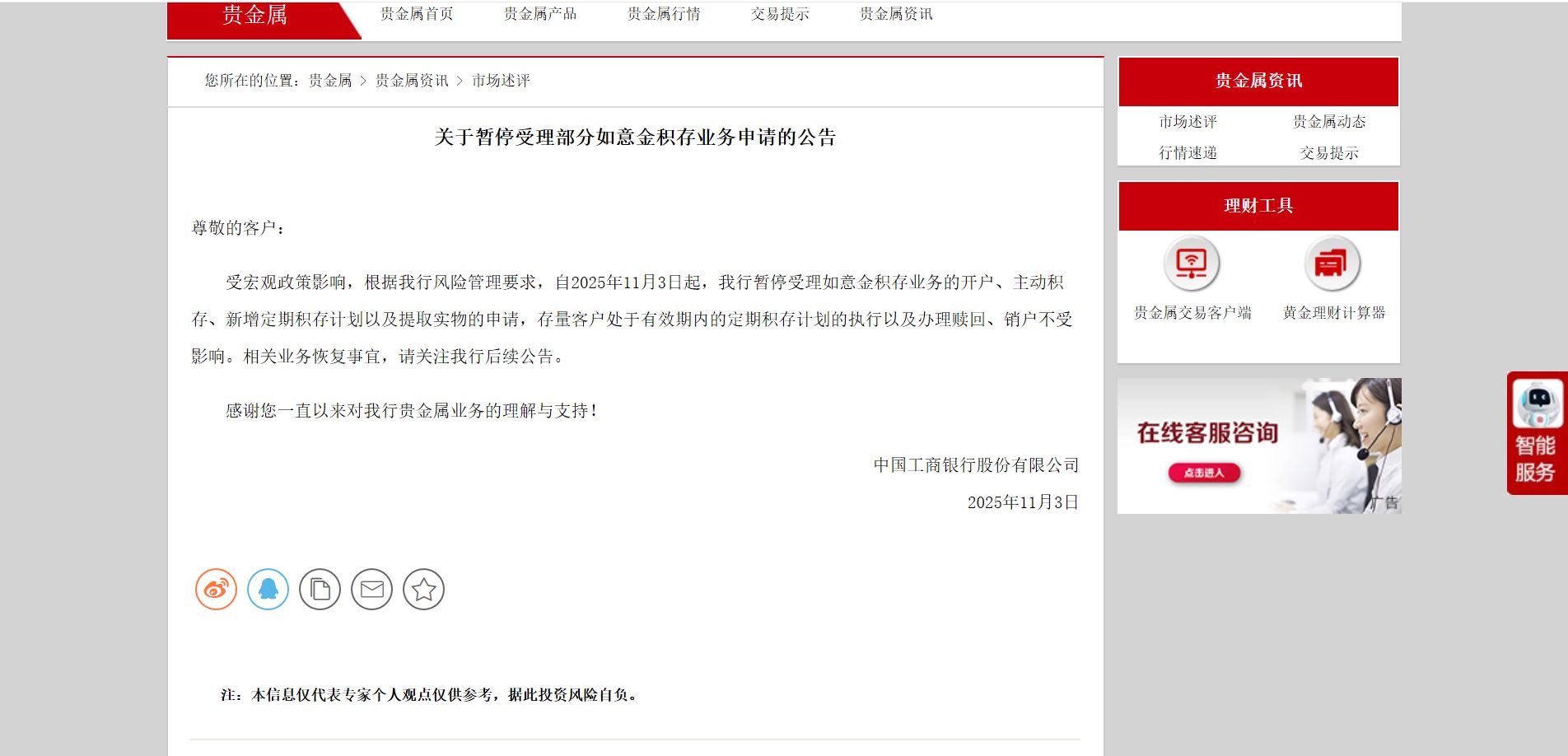 11月3日,工商銀行今日發(fā)布公告,受宏觀政策影響,根據(jù)我行風險管理要求,自2025年11月3日起,我行暫停受理如意金積存業(yè)務的開戶、主動積存、新增定期積存計劃以及提取實物的申請,存量客戶處于有效期內(nèi)的定期積存計劃的執(zhí)行以及辦理贖回、銷戶不受影響。相關(guān)業(yè)務恢復事宜,請關(guān)注我行后續(xù)公告。