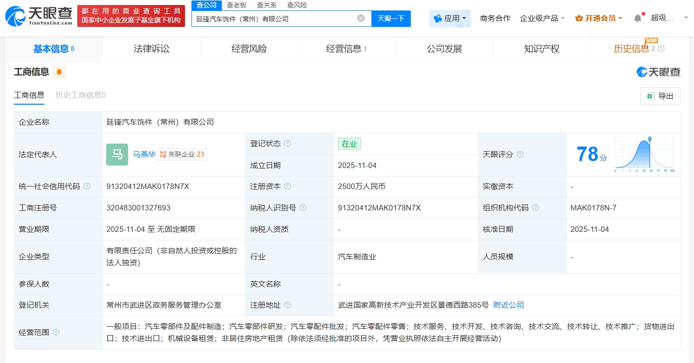 每經(jīng)AI快訊,天眼查App顯示,近日,延鋒汽車飾件(常州)有限公司成立,法定代表人為馬燕華,注冊(cè)資本2500萬(wàn)元人民幣,經(jīng)營(yíng)范圍包括汽車零部件及配件制造、汽車零部件研發(fā)、汽車零配件批發(fā)等。股權(quán)全景穿透圖顯示,該公司由華域汽車(600741)旗下延鋒國(guó)際汽車技術(shù)有限公司全資持股。