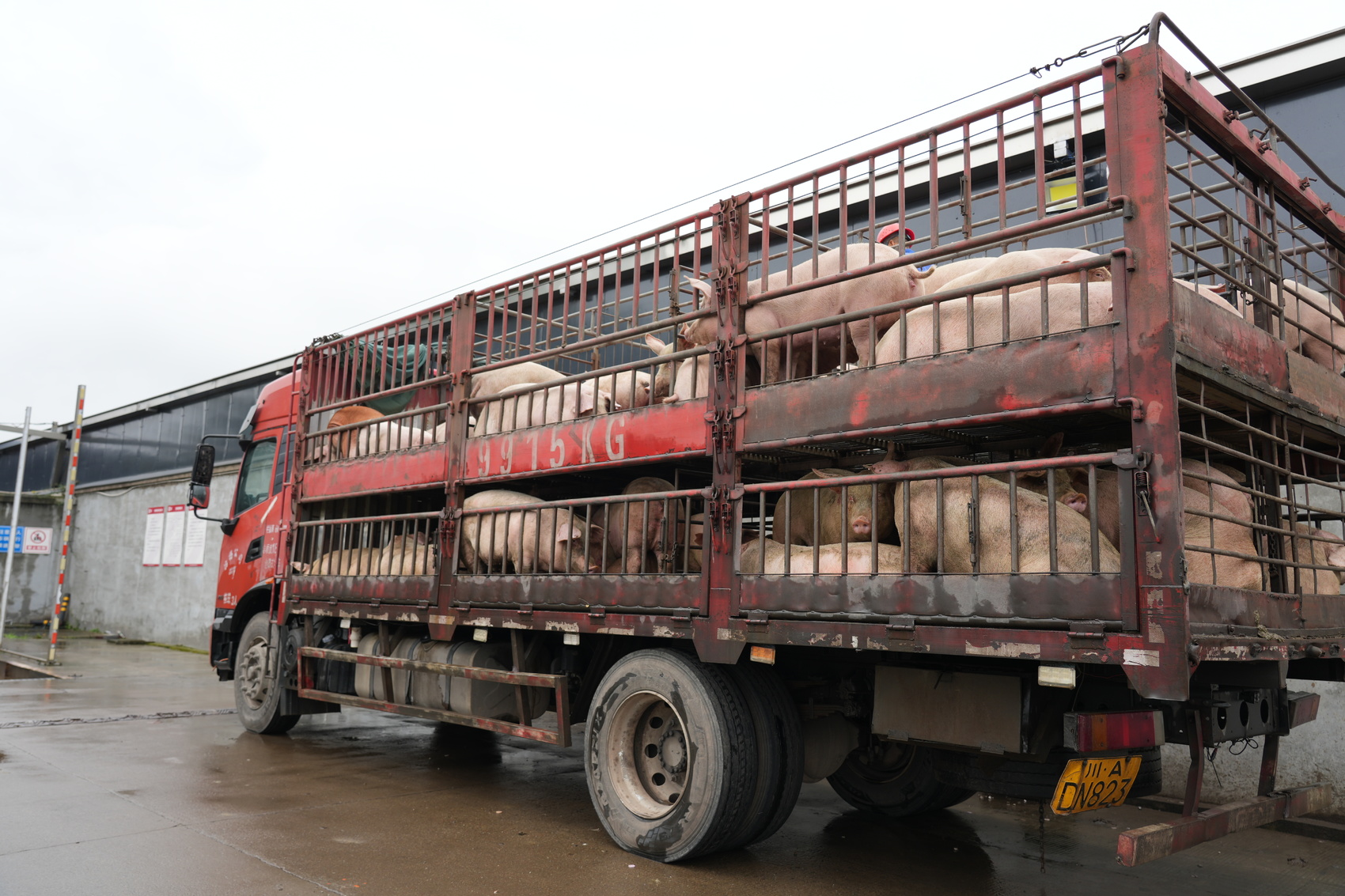 10月31日下午4點(diǎn),一輛川A牌照的生豬運(yùn)輸車緩緩?fù)?吭谖挥谮鰨埵械乃拇ń鹬沂称饭煞萦邢薰荆ㄒ韵潞喎Q“金忠食品”)屠宰場后門。生豬驗(yàn)收員胥莎快步上前,將手機(jī)遞給已在車廂豬群里等候的駕駛員,并叮囑他給每頭豬的耳標(biāo)逐一拍照,以便稍后上傳至“四川智慧動(dòng)監(jiān)”系統(tǒng)。