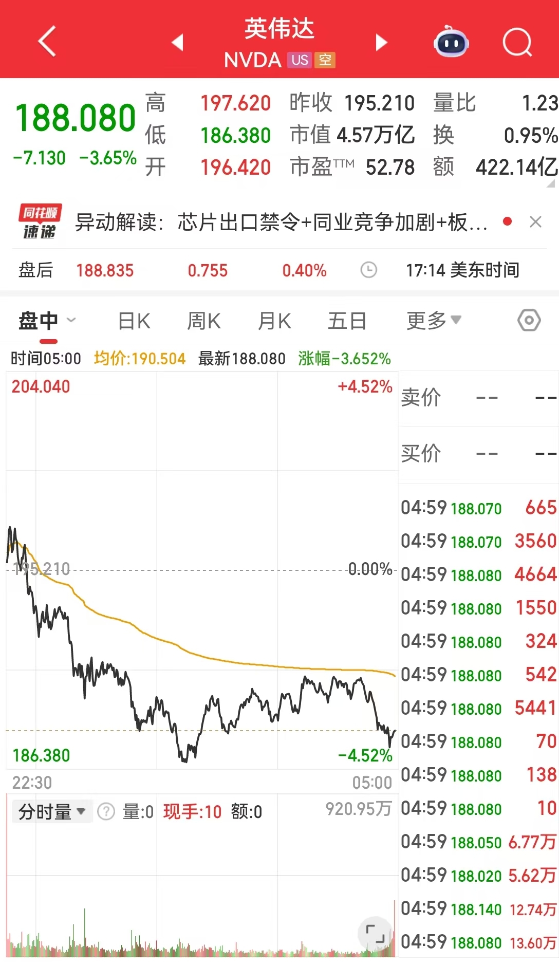 英偉達(dá)報(bào)188.08美元,跌幅3.65%,最新市值4.57萬(wàn)億美元,其市值一夜蒸發(fā)1733億美元(約合人民幣12337.92億元)。