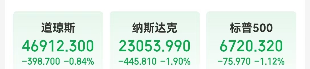 當(dāng)?shù)貢r(shí)間11月6日,美股三大指數(shù)集體收跌,納指下跌445.81點(diǎn),跌幅1.90%;標(biāo)普500指數(shù)跌1.12%;道指跌0.84%。