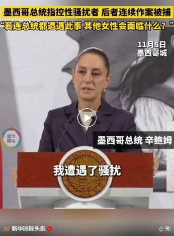 另據(jù)新華社,墨西哥總統(tǒng)辛鮑姆11月5日證實,自己前一天在首都墨西哥城街頭遭一名醉漢猥褻,并已對該男子提出指控。她呼吁各州審查相關法律和程序,方便女性舉報此類行為。