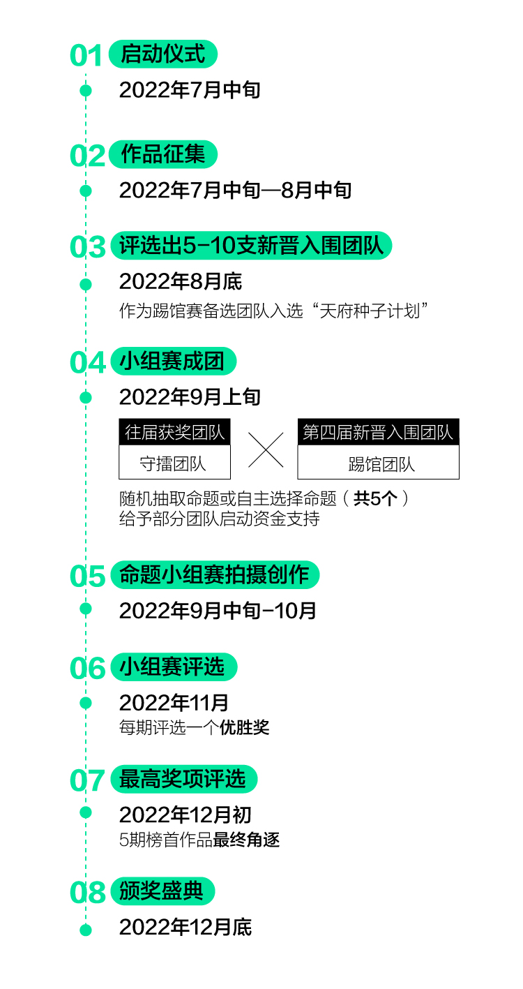 為鼓勵視頻創(chuàng)作,2022年將繼續(xù)啟動“天府種子計劃”,高標(biāo)準(zhǔn)、高質(zhì)量生產(chǎn)以成都為主題/背景的影像IP。該計劃將通過“揭榜掛帥”的模式,發(fā)布5-10個提供啟動資金的“種子”項目,通過邀請社會報名、機構(gòu)推薦的形式,征集評選出視頻行業(yè)有潛力的承接團隊、個人。主辦方將組織專業(yè)評審對入圍團隊/個人遞交的資料進行評議打分,選出各個“種子”項目的承接方并予以執(zhí)行。