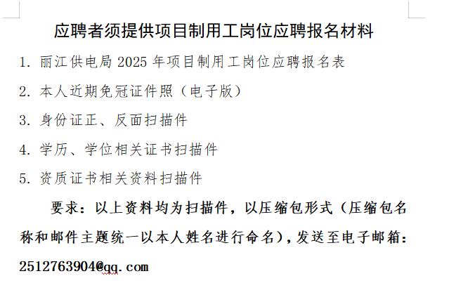 應(yīng)聘者須按照附件3《提交材料清單》提供項(xiàng)目制用工崗位應(yīng)聘報(bào)名材料,填寫附件2《麗江供電局2025年項(xiàng)目制用工崗位應(yīng)聘報(bào)名表》,并附本人近期免冠證件照、身份證、畢業(yè)證、資格證書等相關(guān)材料掃描文件,以壓縮包形式(壓縮包名稱和郵件主題統(tǒng)一以本人姓名進(jìn)行命名),發(fā)送至電子郵箱:2512763904@qq.com。