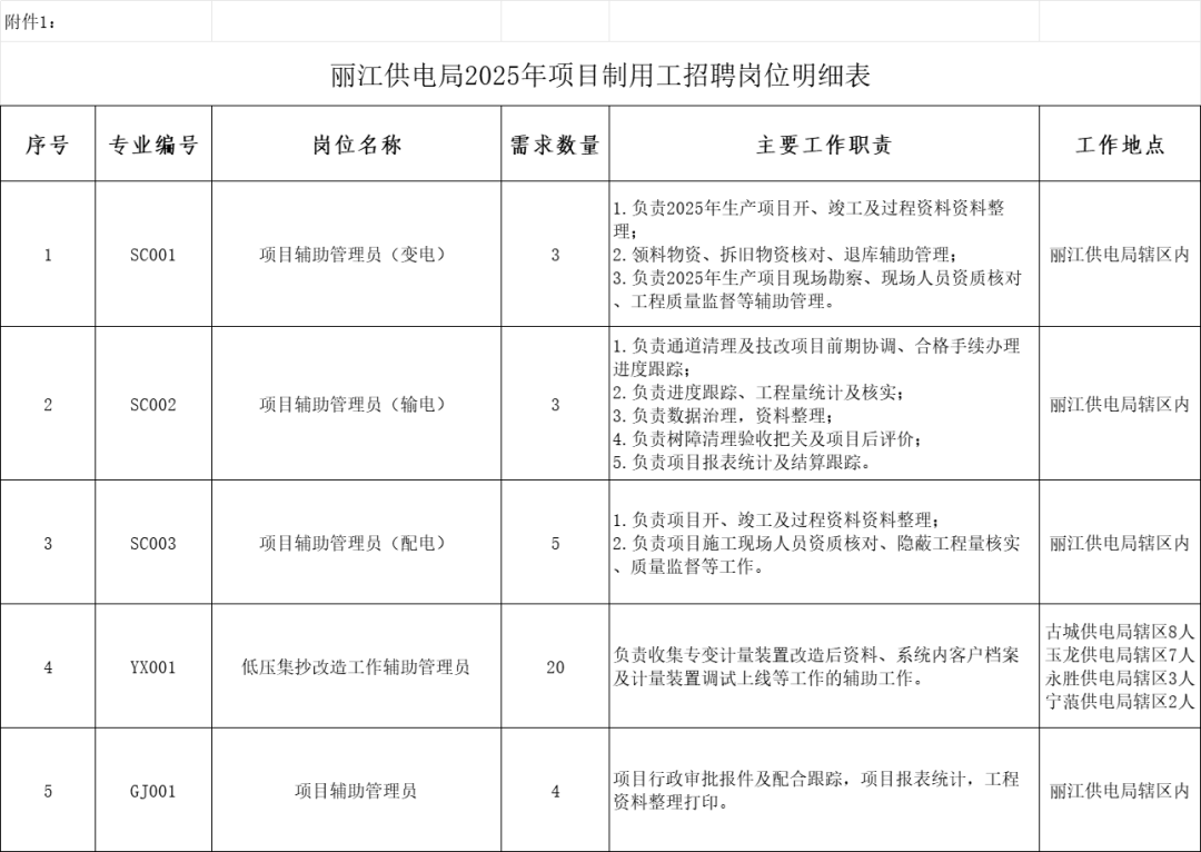 附件1 麗江供電局2025年項(xiàng)目制用工招聘崗位明細(xì)表