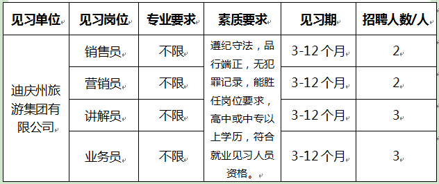 迪慶州旅游集團(tuán)設(shè)置就業(yè)見(jiàn)習(xí)崗位10個(gè),擬招聘青年就業(yè)見(jiàn)習(xí)人員10人(詳見(jiàn)下表)。