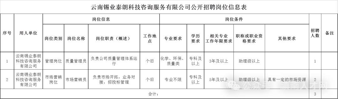 1.《云南錫業(yè)泰朗科技咨詢服務(wù)有限公司公開招聘崗位信息表》