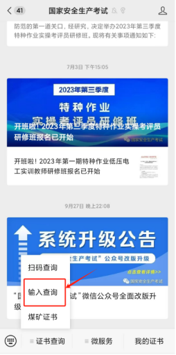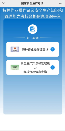 方式二:微信搜索并關(guān)注官方微信公眾號“國家安全生產(chǎn)考試”,點擊證書查詢→輸入查詢,查詢證書信息及復(fù)審時間。