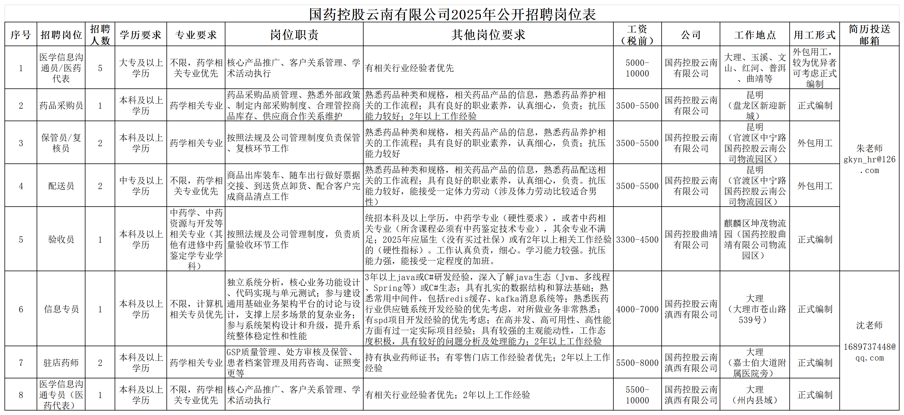 附件1:國(guó)藥控股云南有限公司2025年公開招聘崗位表