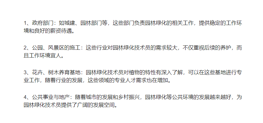 4、想提升自己的知識(shí)技能,增加崗位待遇,擴(kuò)大職業(yè)發(fā)展方向的人:通過考取園林綠化工證書,可以提升個(gè)人專業(yè)技能,增加崗位待遇,并拓寬職業(yè)發(fā)展方向。