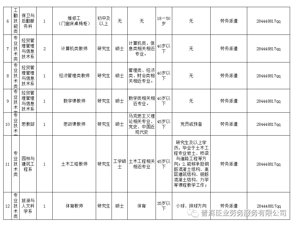 (五)報考專職教師崗位要求全日制研究生學(xué)歷及碩士以上學(xué)位(具體要求詳見附表);報考管理崗位要求全日制本科學(xué)歷及學(xué)士以上學(xué)位(部分崗位限專業(yè),具體要求詳見附表)。報專業(yè)技術(shù)崗位思教部者,黨員或預(yù)備黨員優(yōu)先。