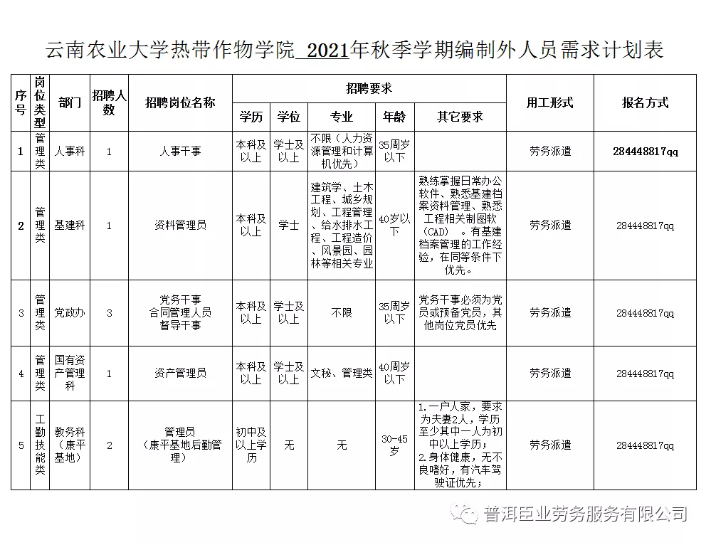 工作人員18名,均為云南農(nóng)業(yè)大學(xué)熱帶作物學(xué)院非事業(yè)編制人員(即編制外合同制人員),具體崗位信息詳見附件。