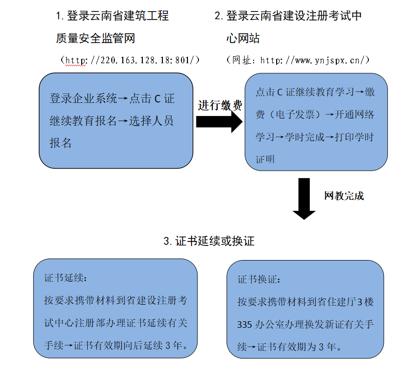 云南省建筑施工企業(yè)專職安全生產(chǎn)管理人員 (C證)繼續(xù)教育報名學習流程圖