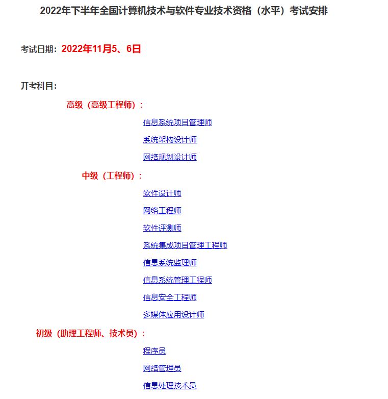 2、中級(jí)資格:軟件設(shè)計(jì)師、網(wǎng)絡(luò)工程師、軟件評(píng)測(cè)師、系統(tǒng)集成項(xiàng)目管理工程師、信息系統(tǒng)監(jiān)理師、信息系統(tǒng)管理工程師、信息安全工程師、多媒體應(yīng)用設(shè)計(jì)師;